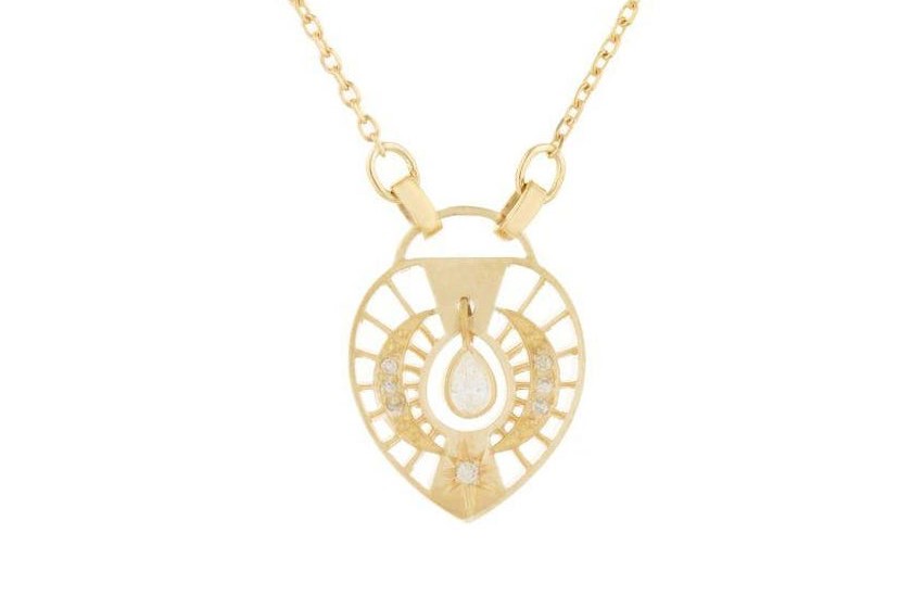 Liontin kalung 14K dari Celine Daoust ini menampilkan beberapa motif, menciptakan desain tatto yang unik.
