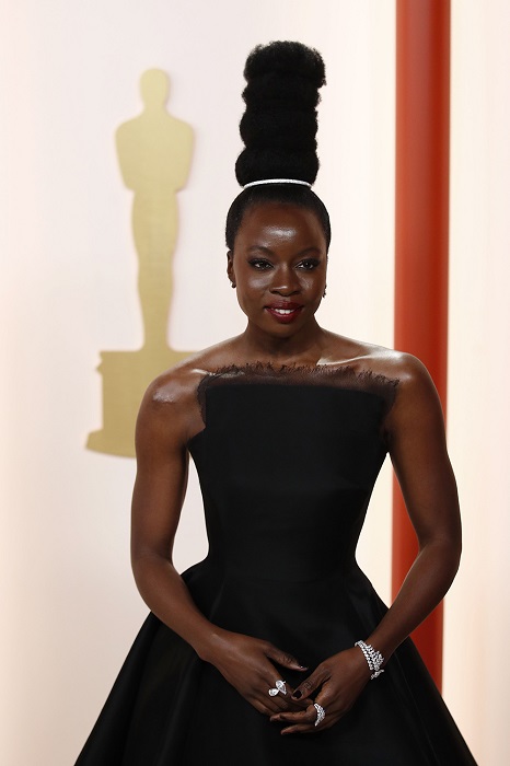 Danai Gurira, bintang Black Panther: Wakanda Forever, dihiasi berlian MESSIKA mulai dari hiasan rambut hingga anting-anting, gelang dan cincin. Dia mengenakan berlian tersebut dengan gaun kustom hitam strapless Jason Wu. Foto: Shutterstock.