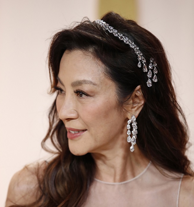 Michelle Yeoh menginspirasi dengan MOUSSAIEFF High Jewelry dan memakai kalung yang berubah menjadi hiasan rambut, anting-anting berlian yang panjang dan cincin berlian. Foto: Shutterstock.