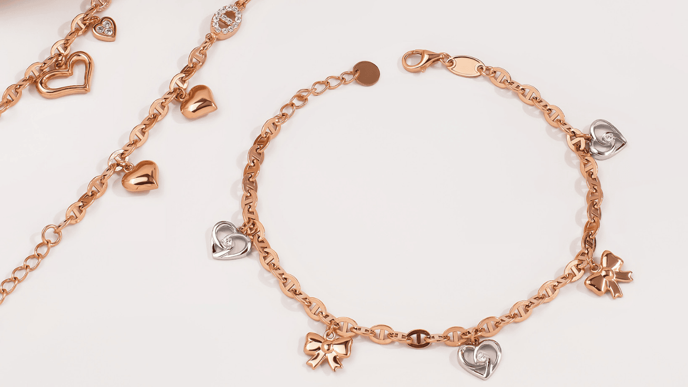 Keanggunan gelang rose gold dengan pendant hati dan pita ini adalah perpaduan antara seni kriya yang halus dan momentum pasar yang menguntungkan.