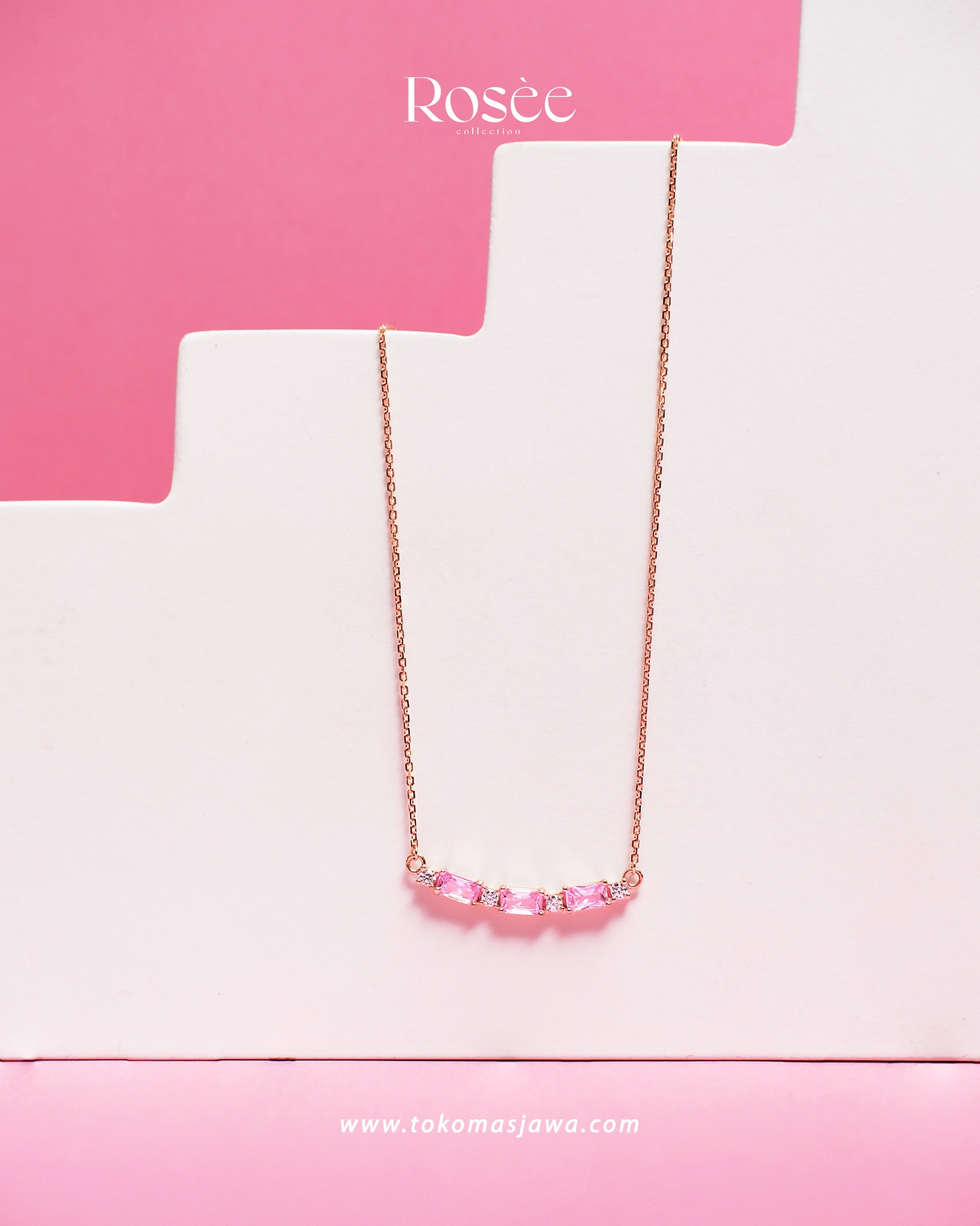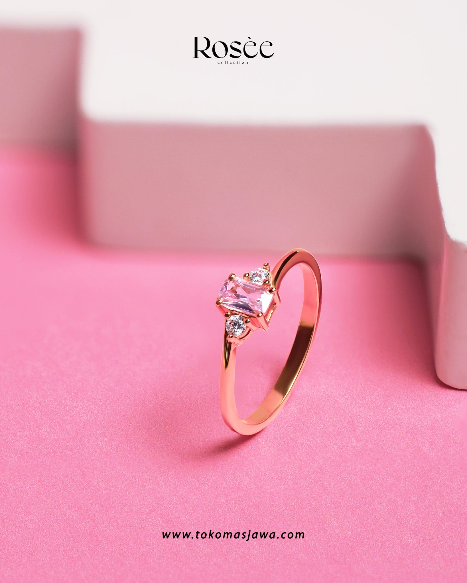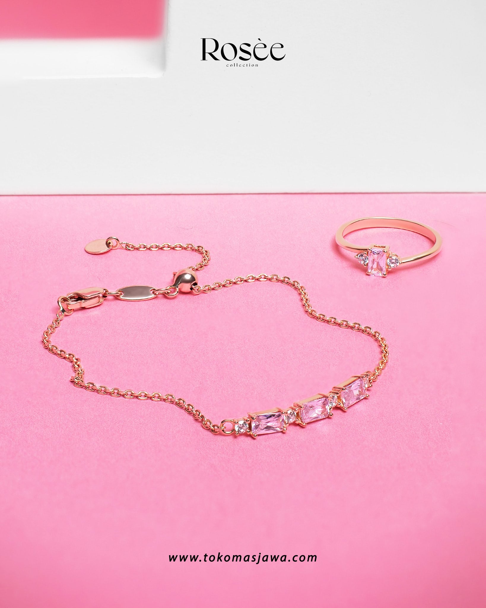 Selain dari namanya yang unik, koleksi perhiasan ini memiliki desain yang menawan yaitu square cut stone pink. Bentuk perhiasan ini terbuat dari batu permata yang dipotong persegi dan didominasi oleh warna pink. Warna pink dari batu permata membuat tampilan perhiasan semakin manis. Koleksi ini terdiri dari kalung, gelang, cincin dan anting-anting. Koleksi perhiasan Rosèe tersedia dalam dua warna yaitu Rose Gold dan White Gold di kadar 10 Karat.