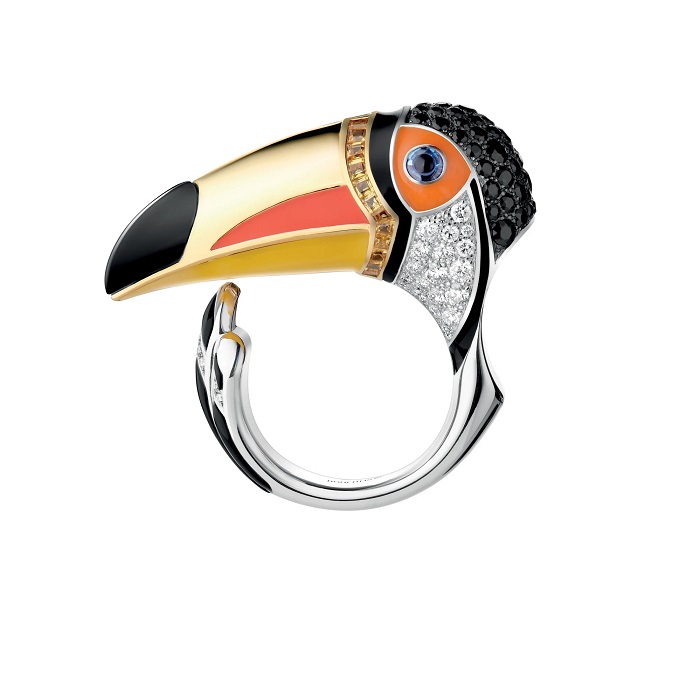 Cincin Le Toucan ini punya fancy-cut orange citrine seberat 27,65 karat, 296 berlian bulat, 1.113 fancy-cut black spinels dan onyx.