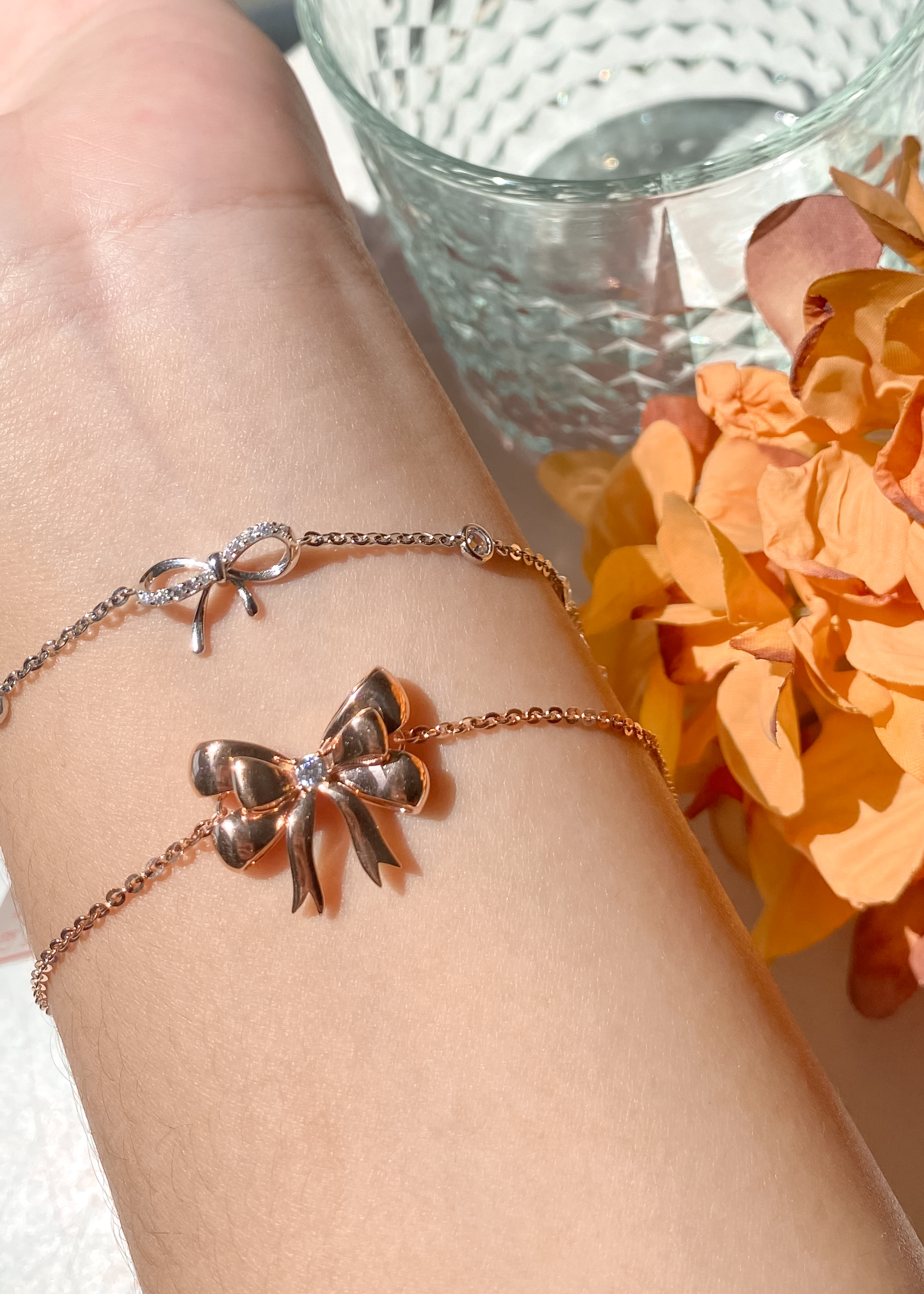 Gelang dengan hiasan pita kecil sebagai charm memberikan nuansa playful namun tetap anggun. Aksesori ini cocok dipadukan dengan outfit bernuansa pastel untuk tampilan sehari-hari.