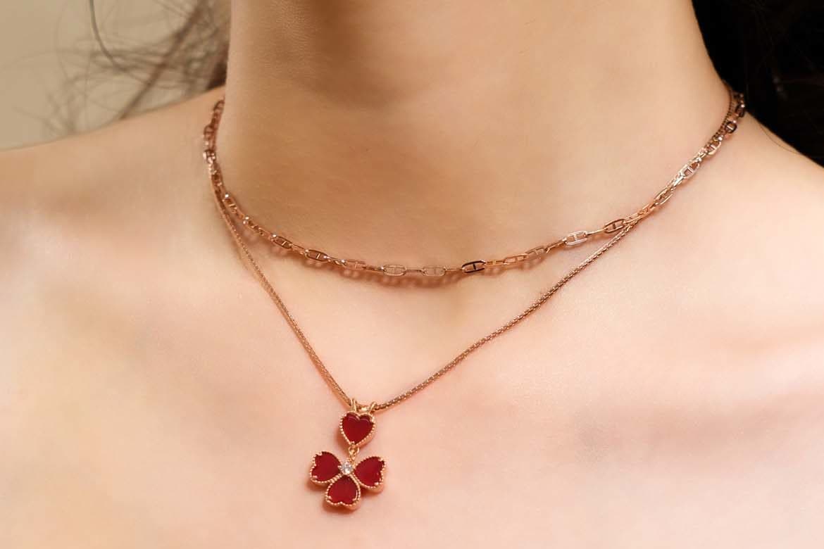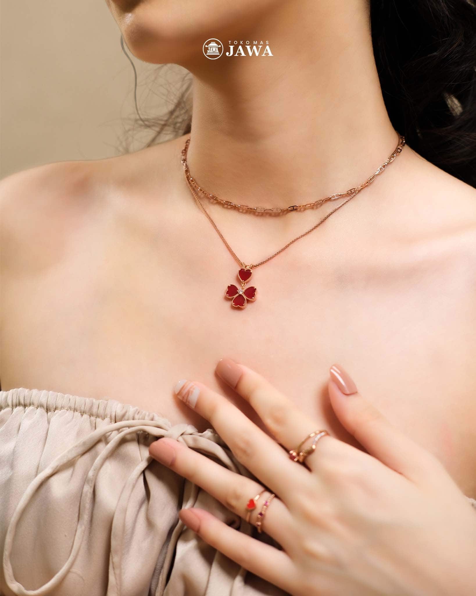 Kalung choker layer kembali ke panggung fashion dengan desain yang lebih modern. Choker tahun ini hadir dengan variasi bahan dari logam, kulit, rantai, hingga dengan hiasan permata, menjadikannya pilihan yang sempurna untuk acara formal maupun kasual.